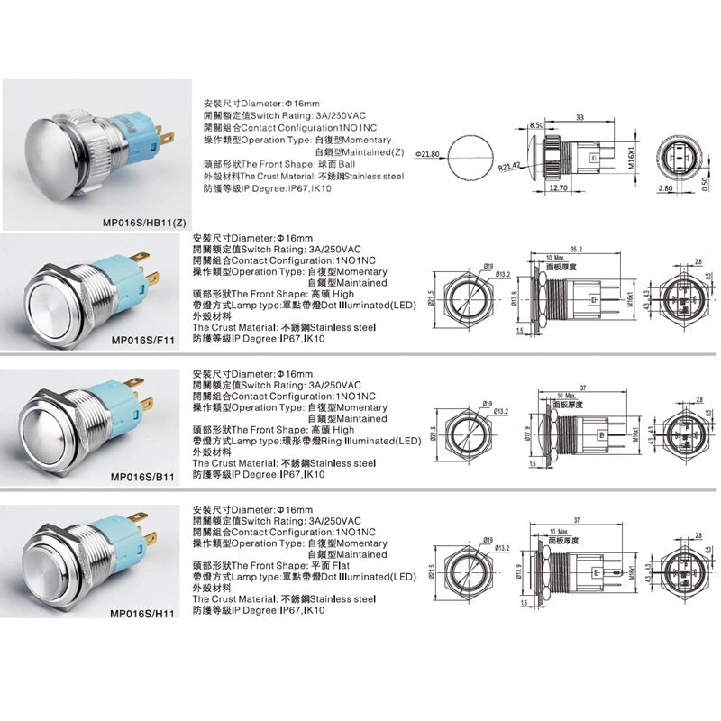 16mm Without LED 1NO1NC IP67 3A 304 Stainless steel Anti-vandal Push button switch