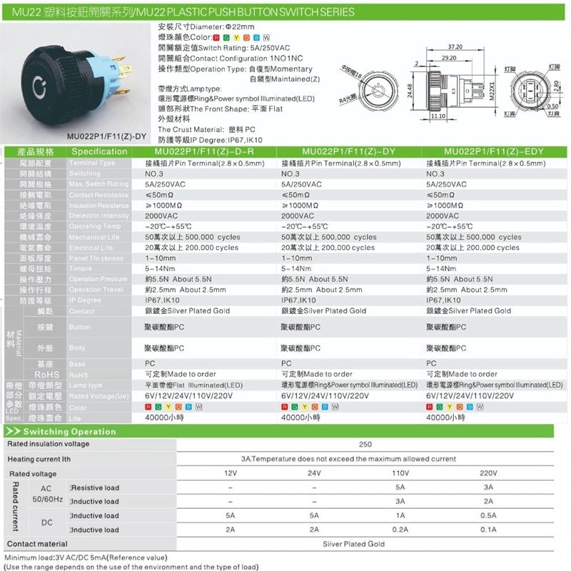 Mechanical Life: Maintained:100,0000 Momentary:100,0000 Selector/Keylock:250000