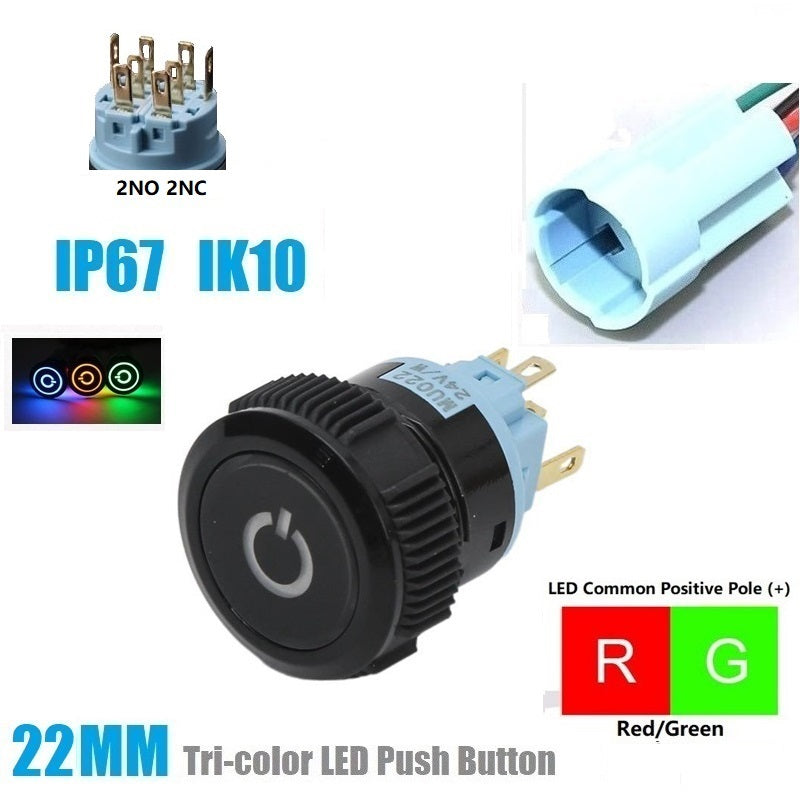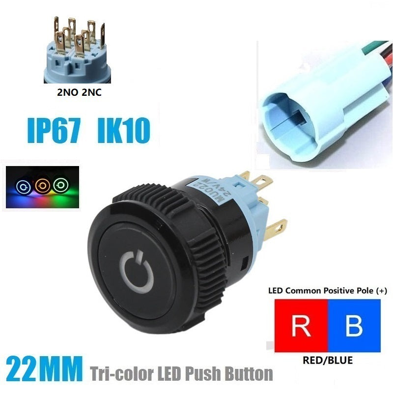 22mm Tri-color Flat Head Ring Power symbol LED DPDT IP67 5A Black Plastic Anti-vandal Push Button Switch