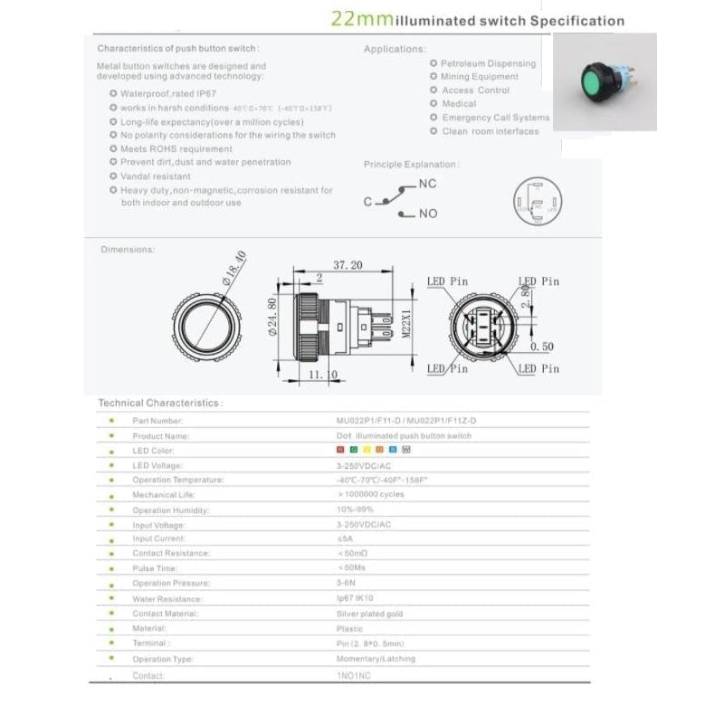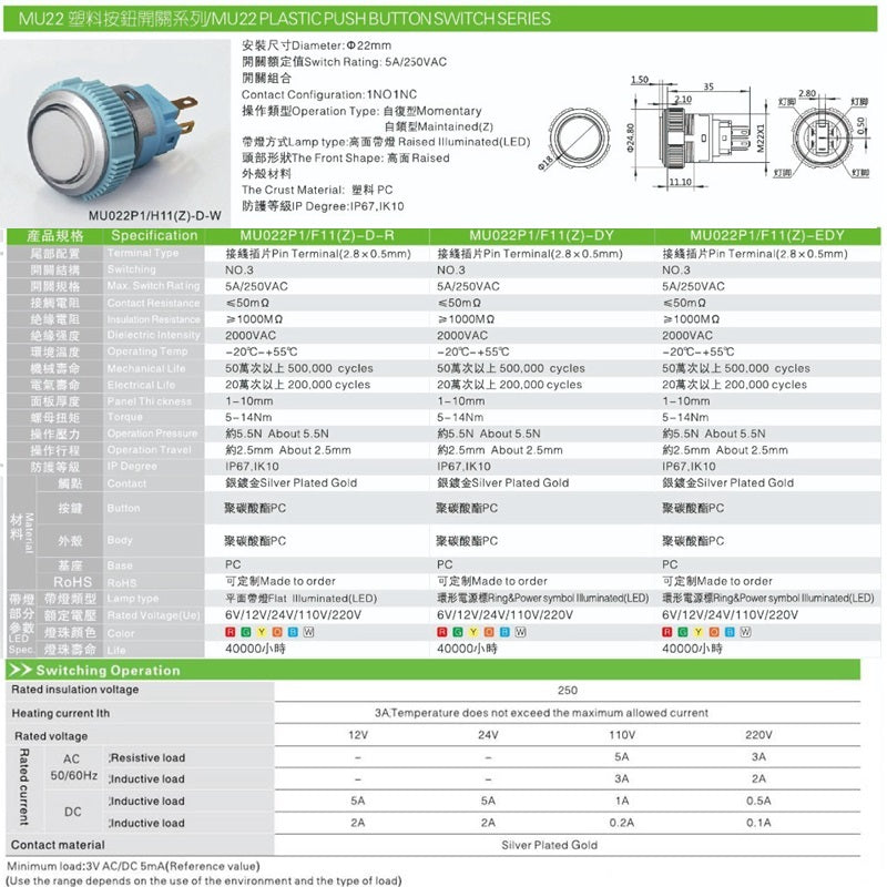 | Mechanical Life: | Maintained:100,0000 Momentary:100,0000 Selector/Keylock:250000 |