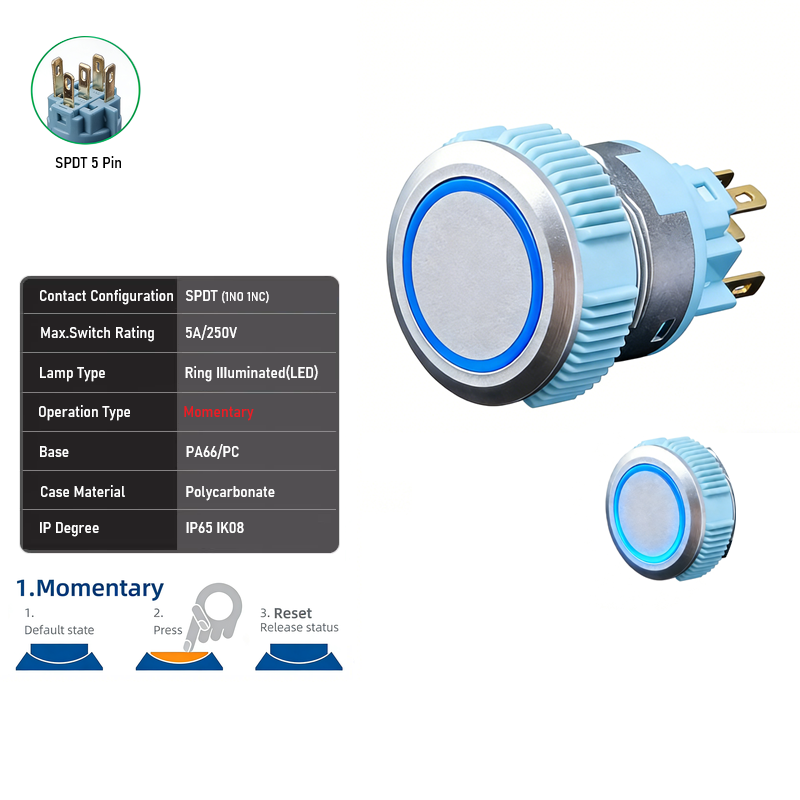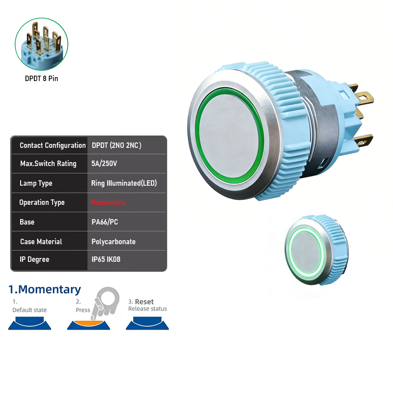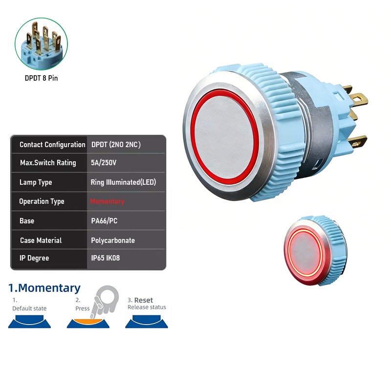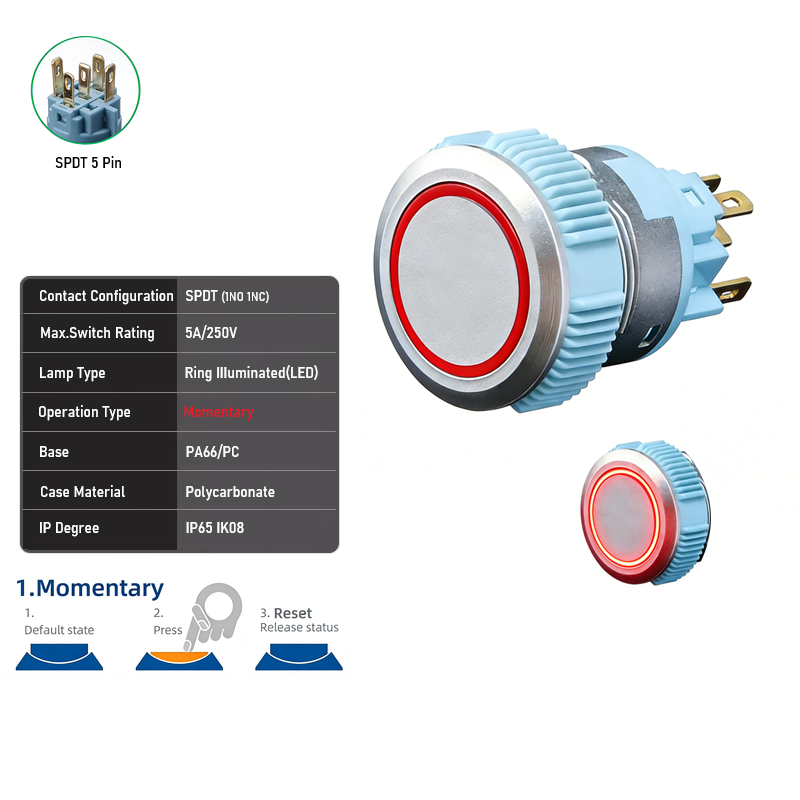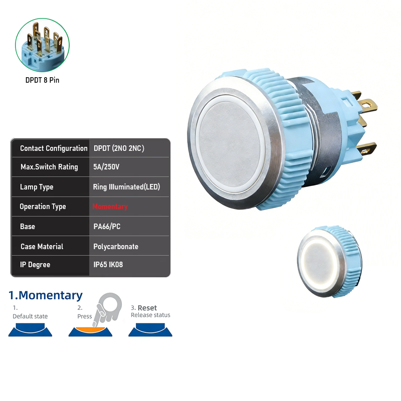 22mm Silver Plastic SPDT DPDT 5A 250VAC IP65 Flat Head+Ring LED Push Button Switch