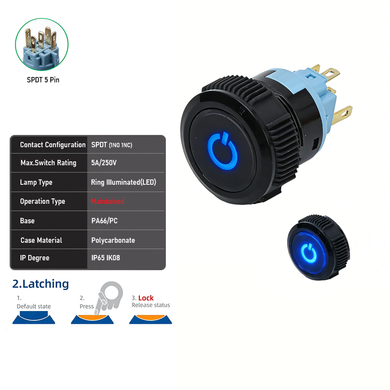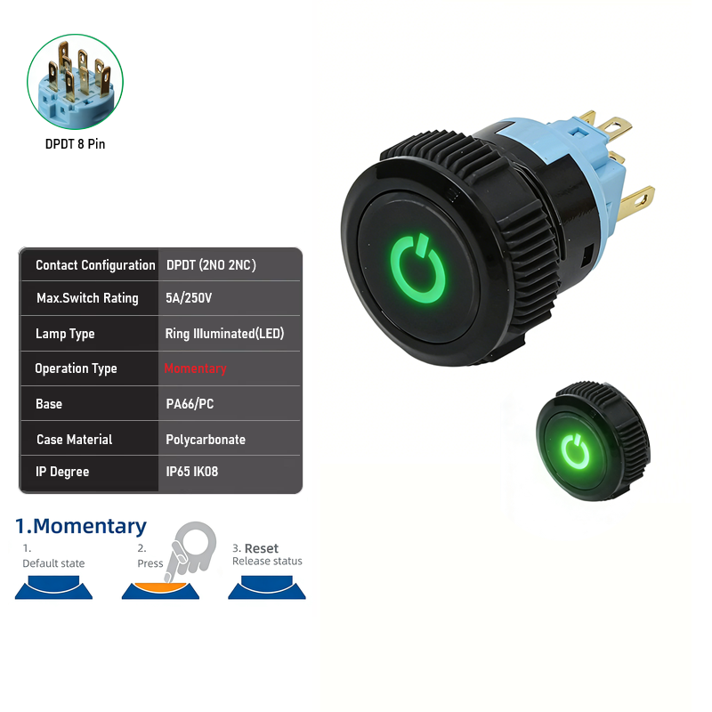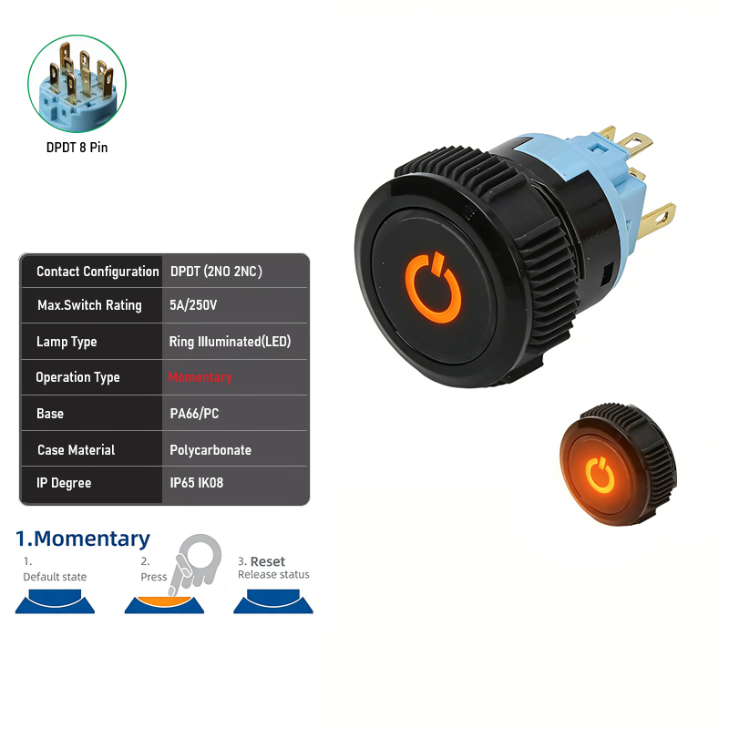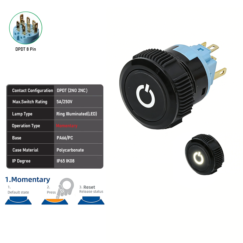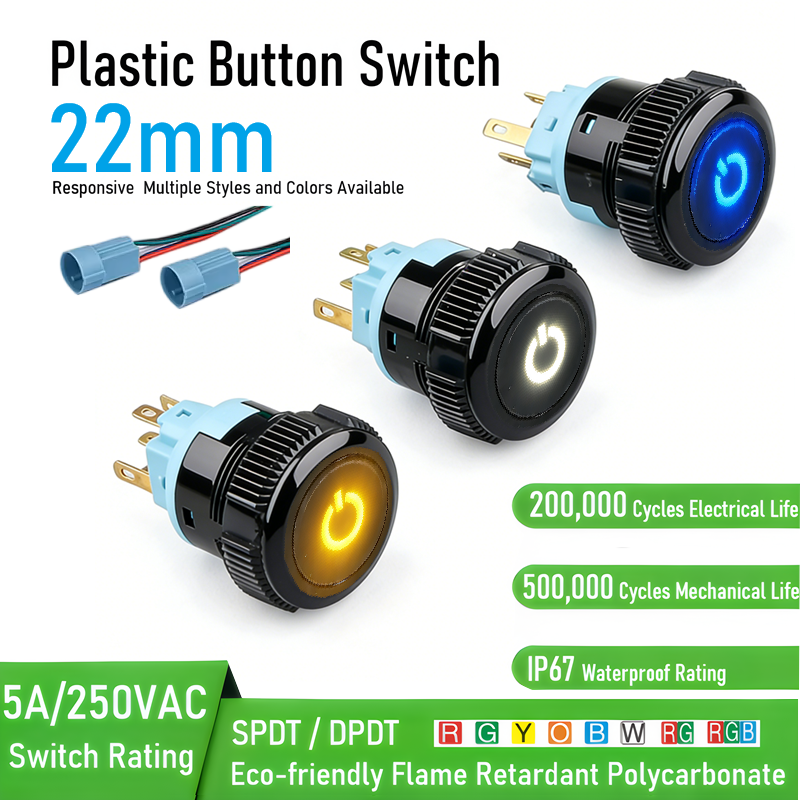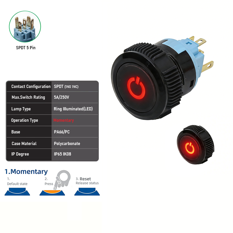 22mm Black Plastic SPDT DPDT 5A 250VAC IP65 Flat Head Power Symbol LED Push Button Switch