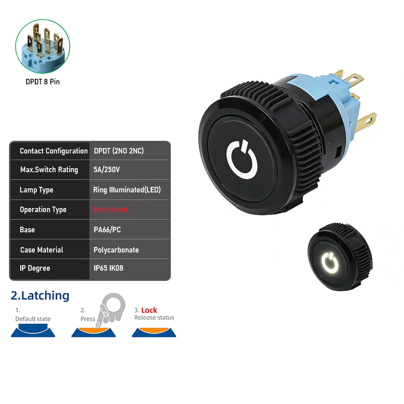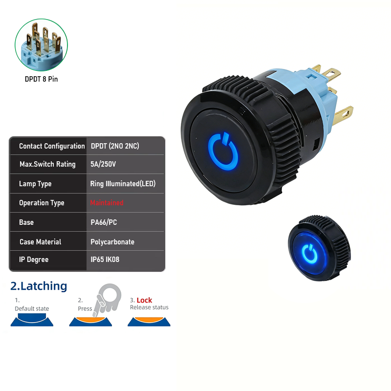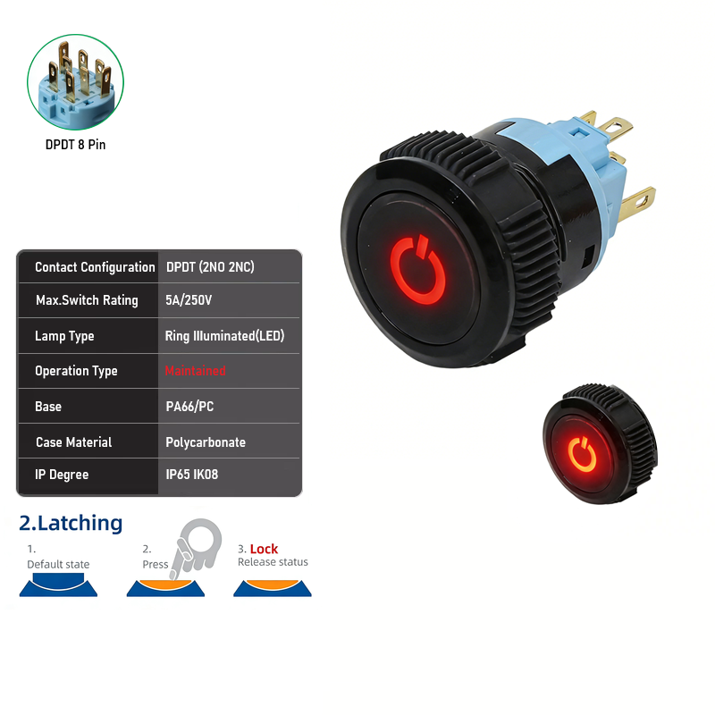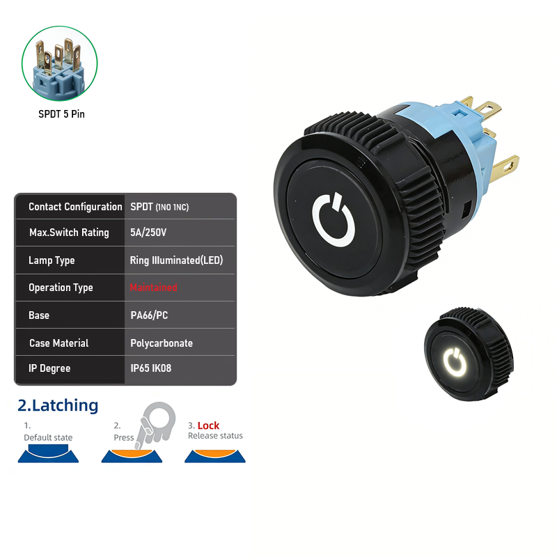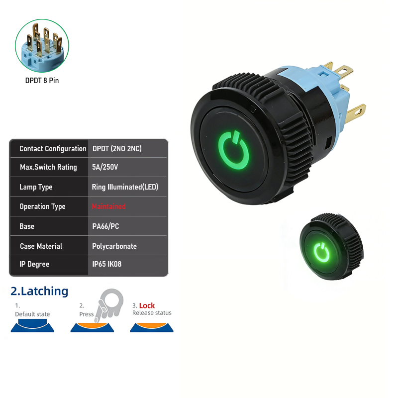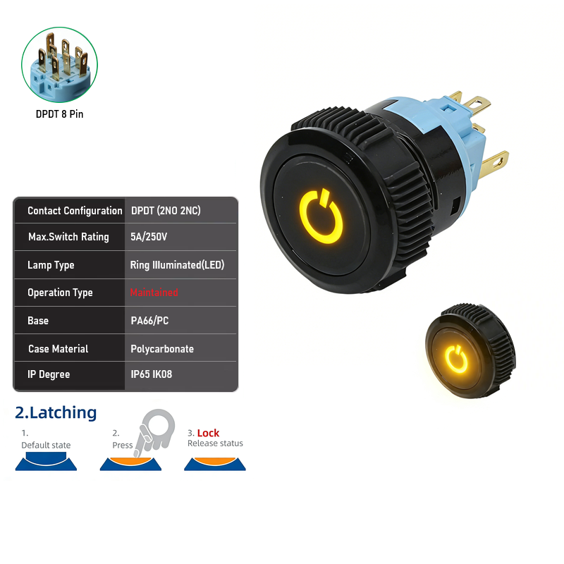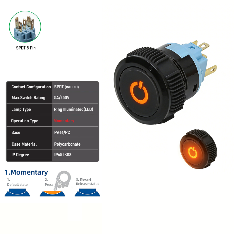 22mm Black Plastic SPDT DPDT 5A 250VAC IP65 Flat Head Power Symbol LED Push Button Switch
