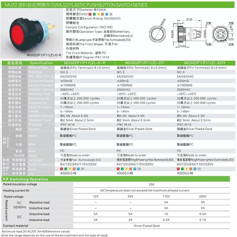 | Mechanical Life: | Maintained:100,0000 Momentary:100,0000 Selector/Keylock:250000 |