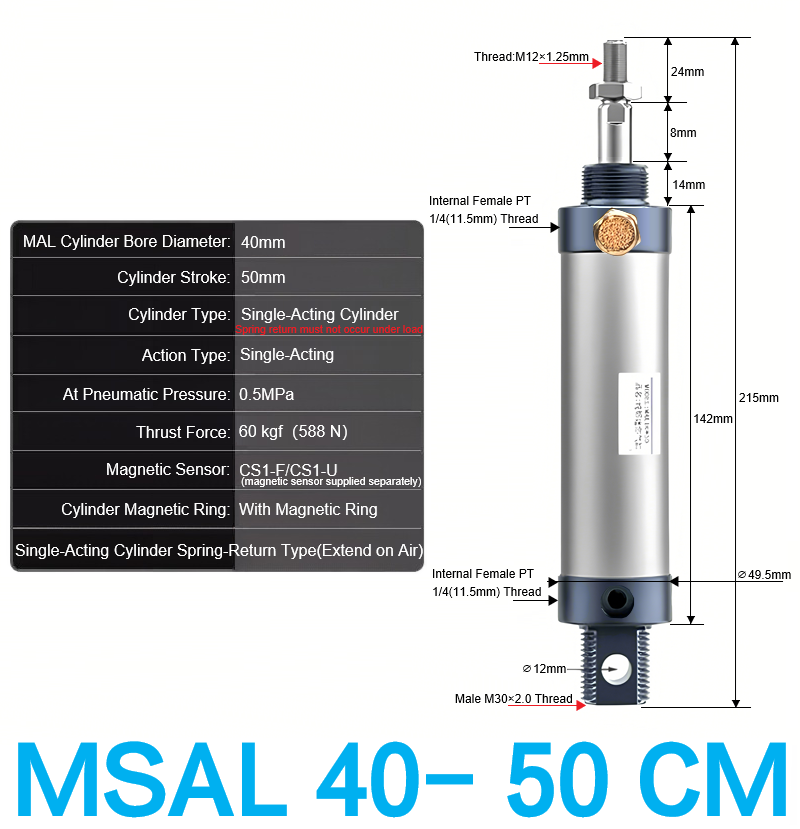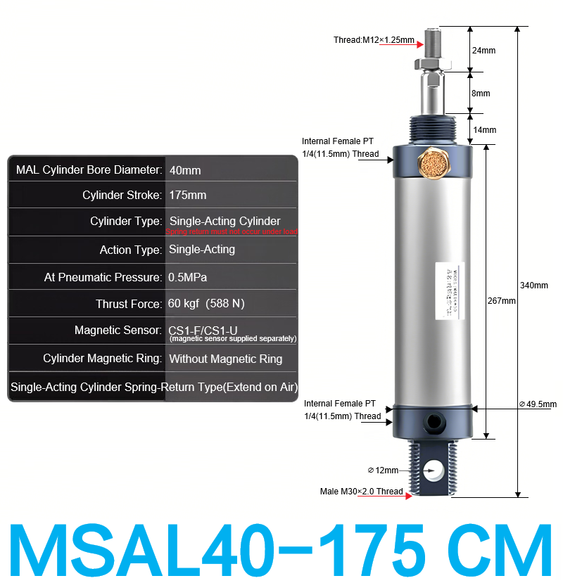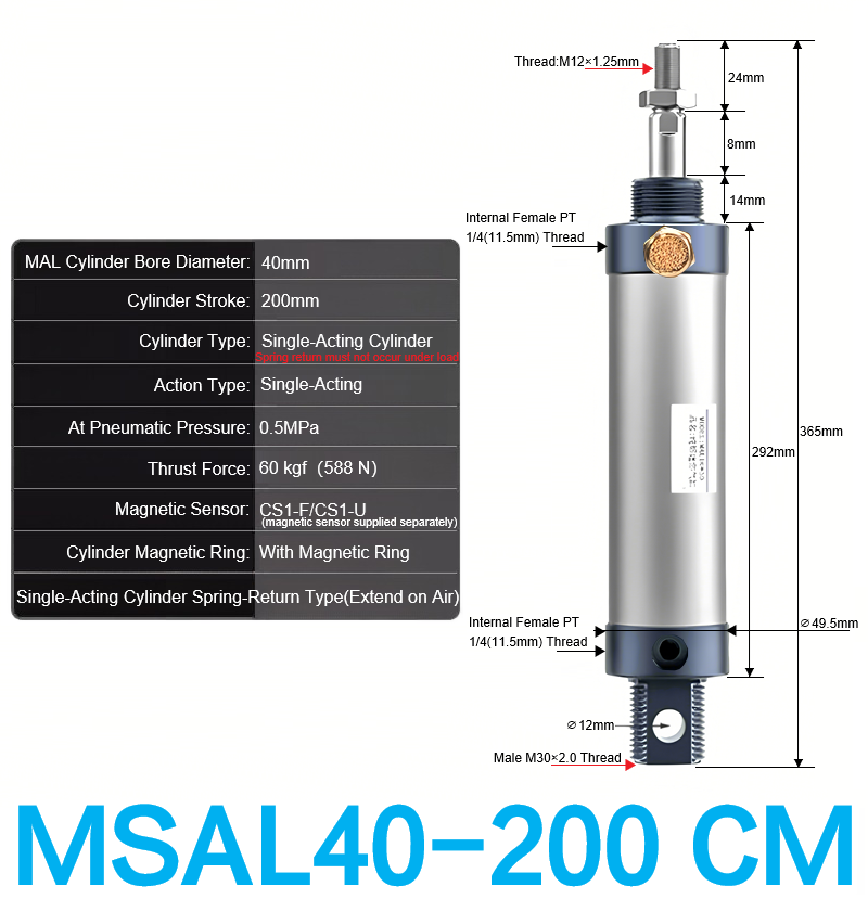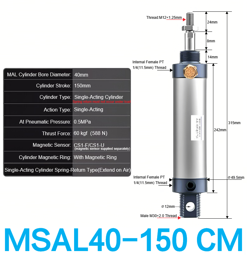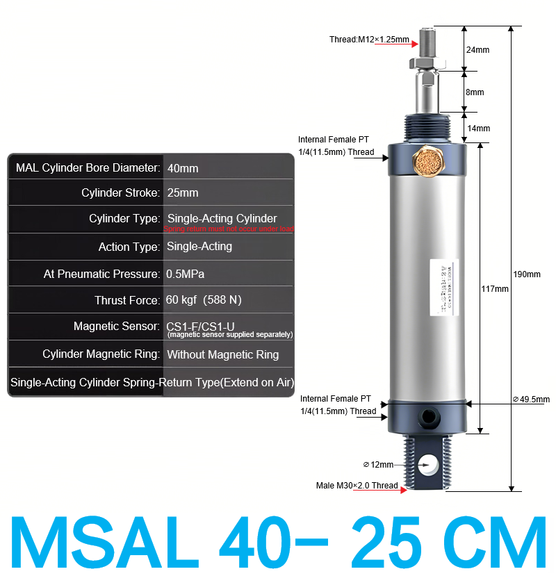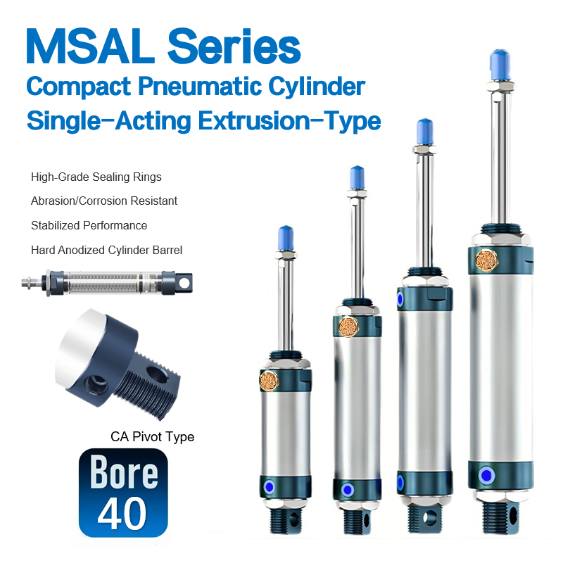 Spring Return Mini Pneumatic Cylinder - 40mm Bore CA-Type Flat Base