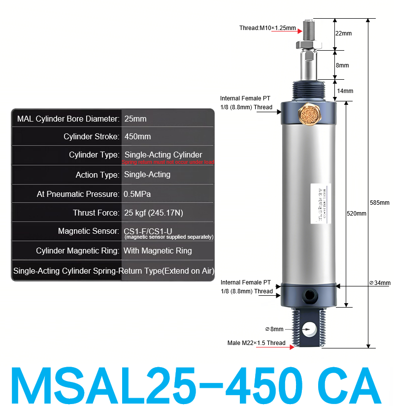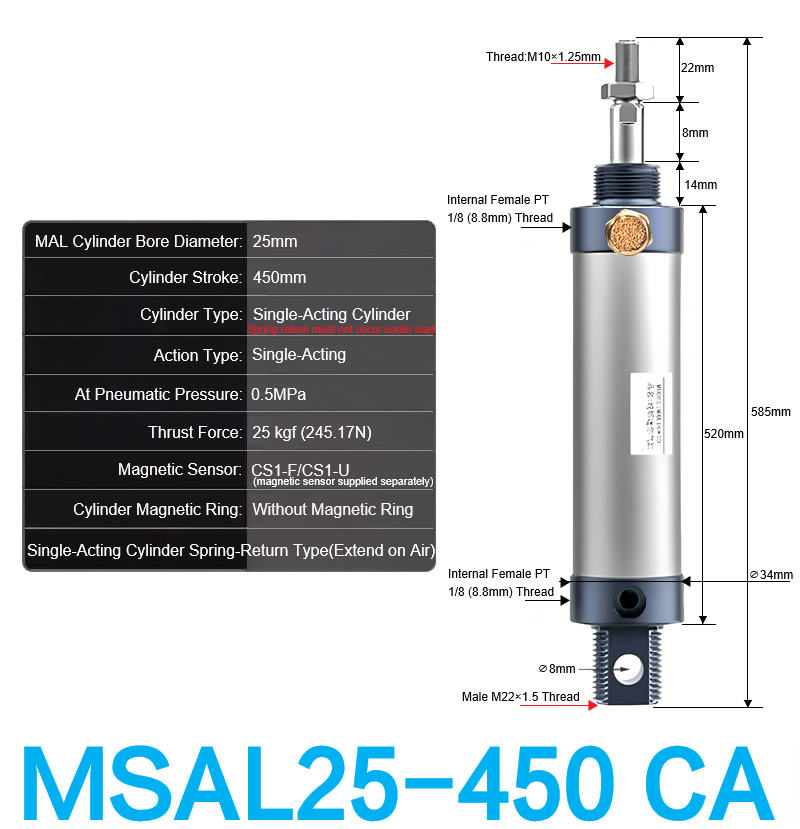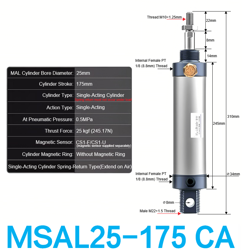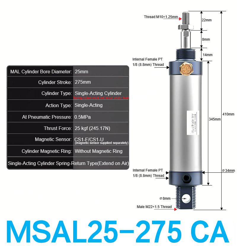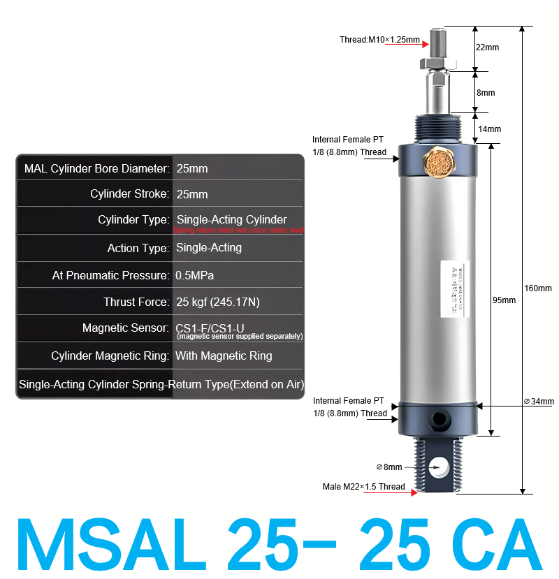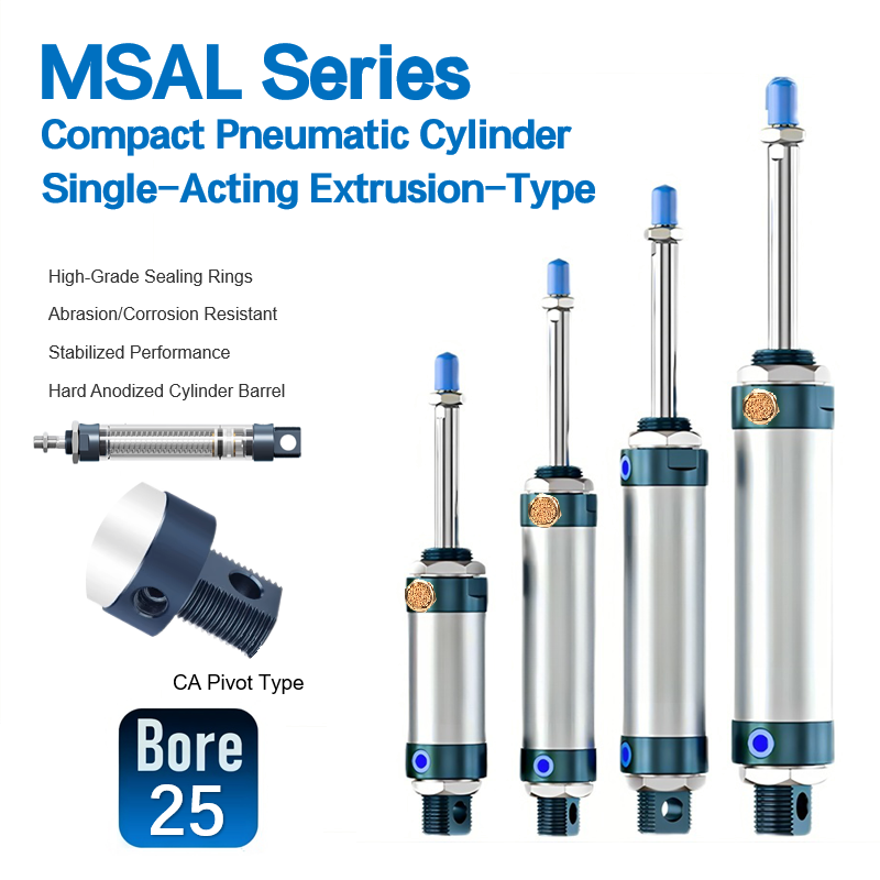 Spring Return Mini Pneumatic Cylinder - 25mm Bore CA-Type Flat Base