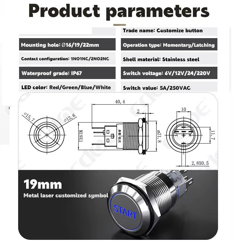 Custom Symbol G2 G3 G4 G5 G6 19mm SPDT 3V-24V Maintained Stainless steel Button LED Symbol Button Switch
