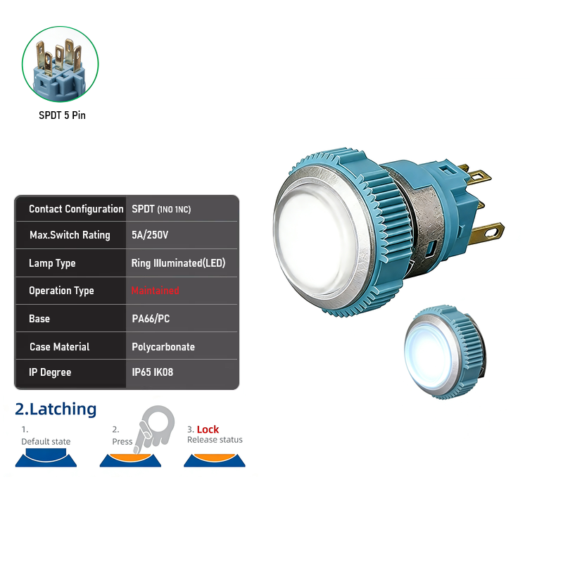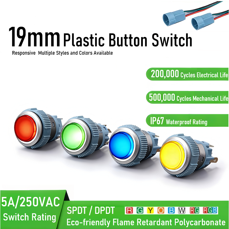19mm Silver Plastic SPDT DPDT 5A IP65 Waterproof High Head+Round LED Push Button Switch
