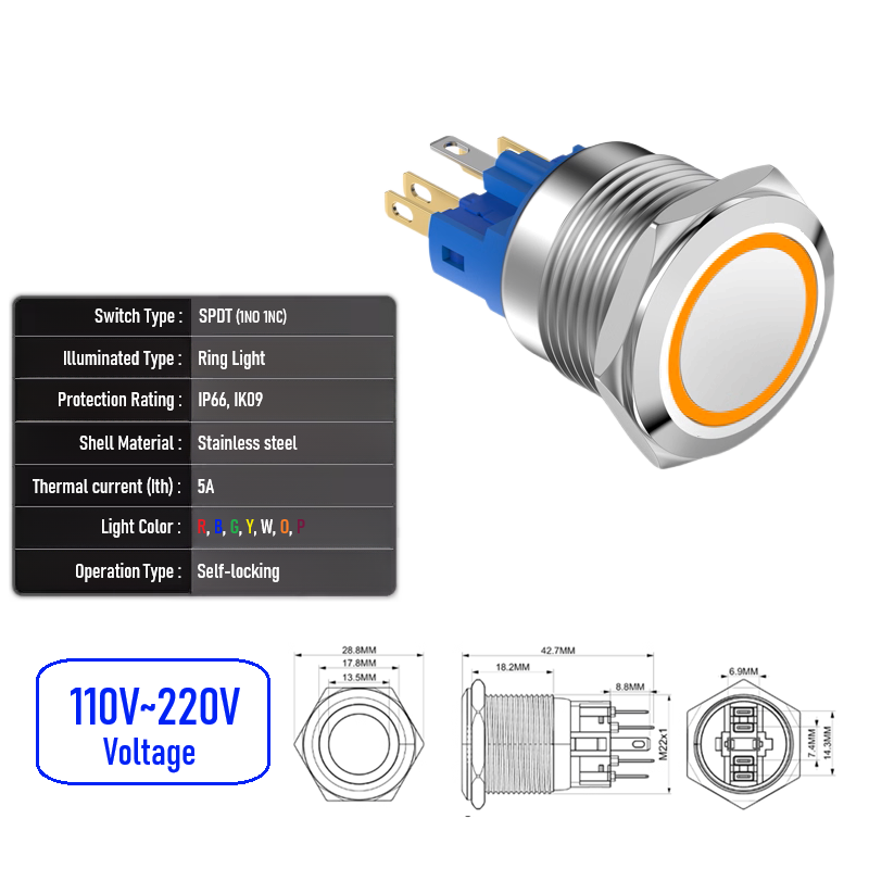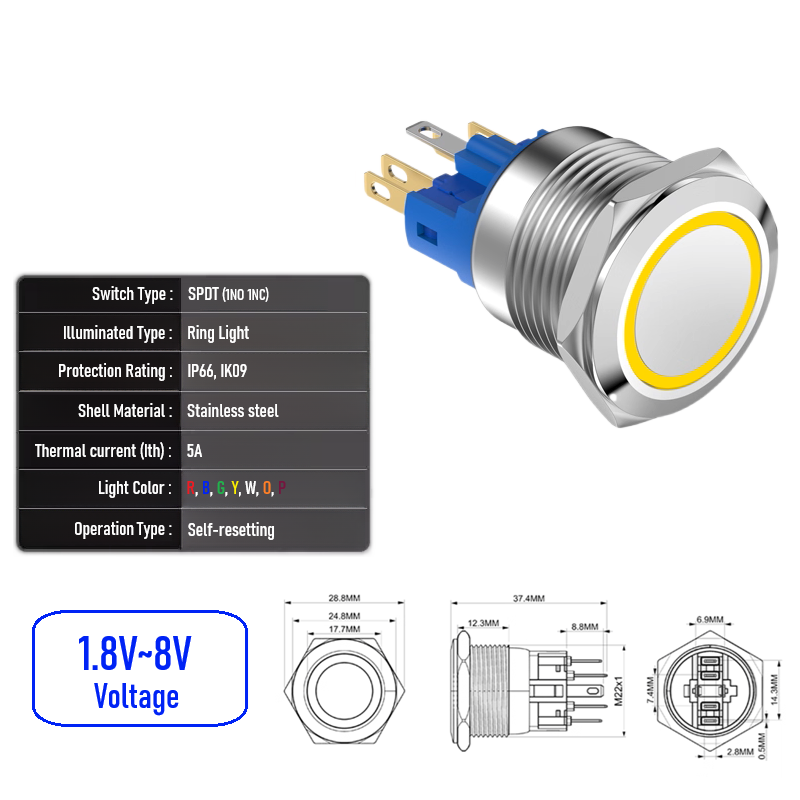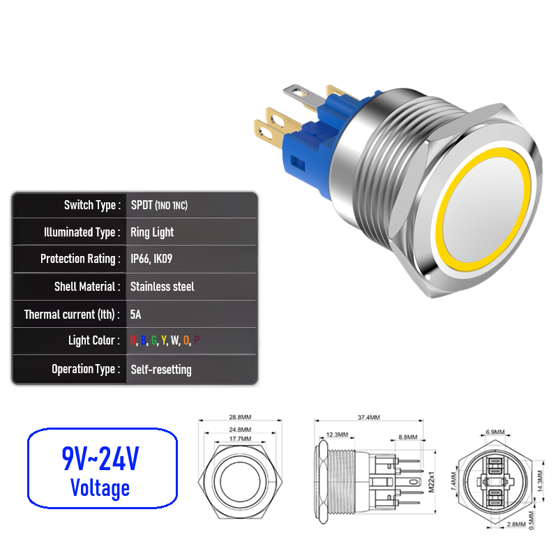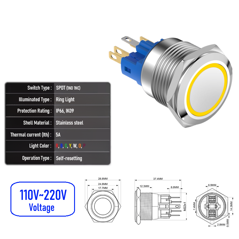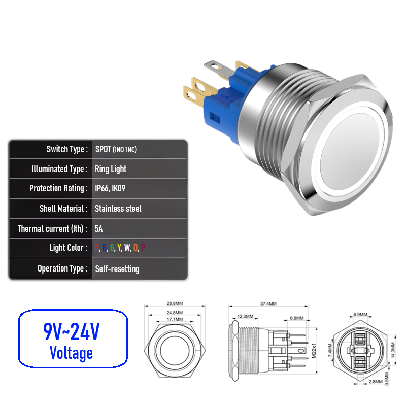 22mm SPDT Ring LED Illuminated Stainless steel Anti-vandal Push Button Switch CE UL ROHS