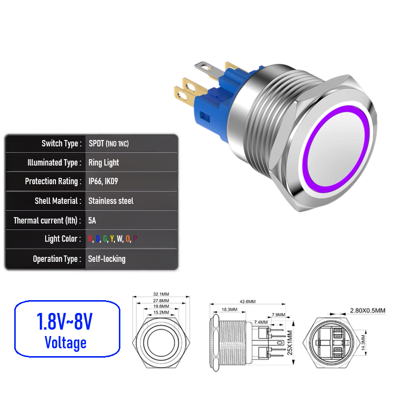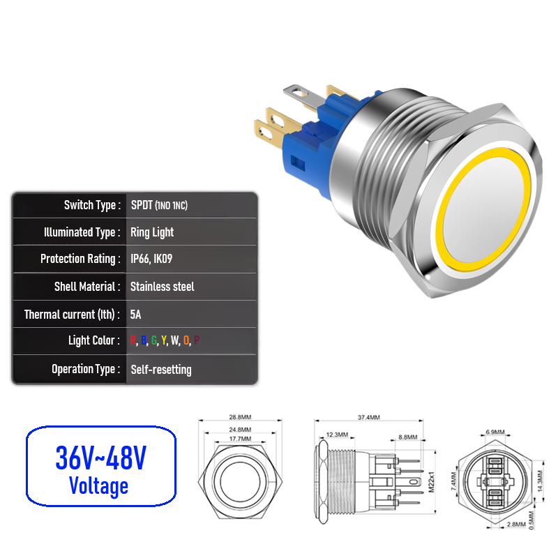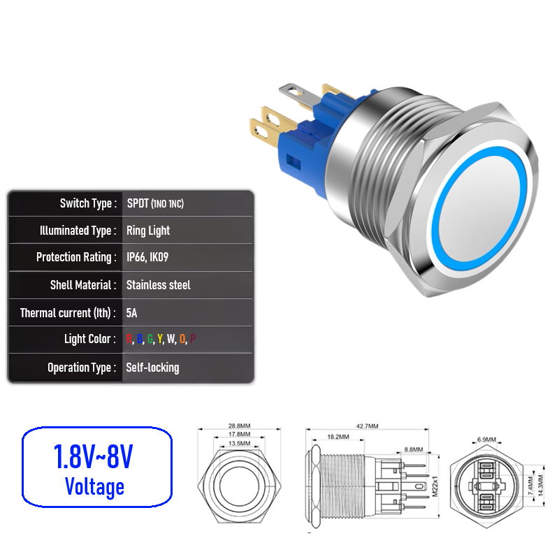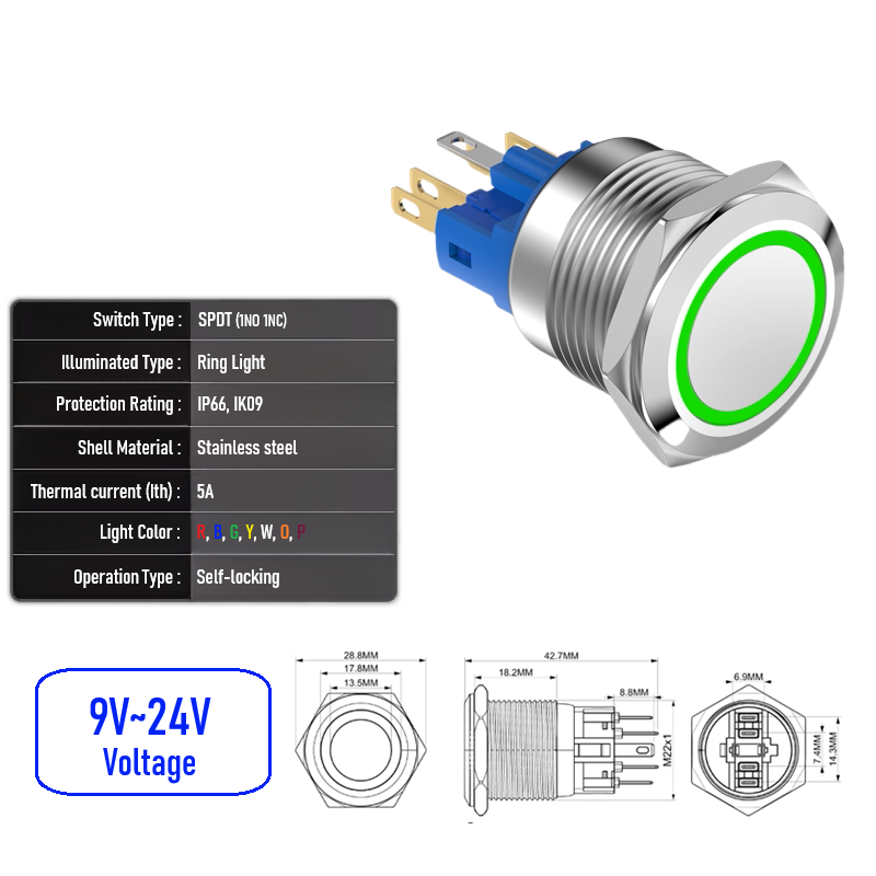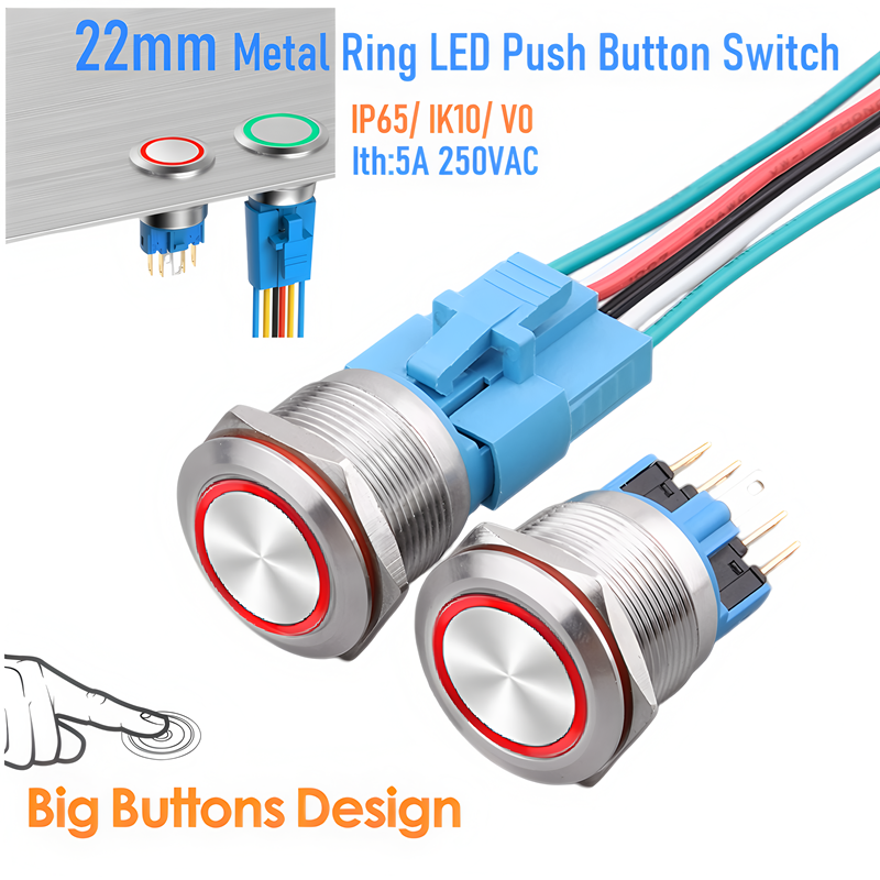 22mm SPDT Ring LED Illuminated Stainless steel Anti-vandal Push Button Switch CE UL ROHS