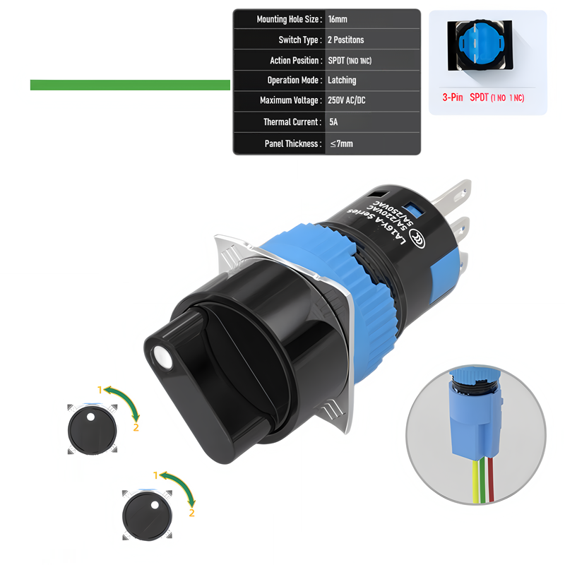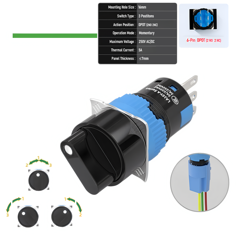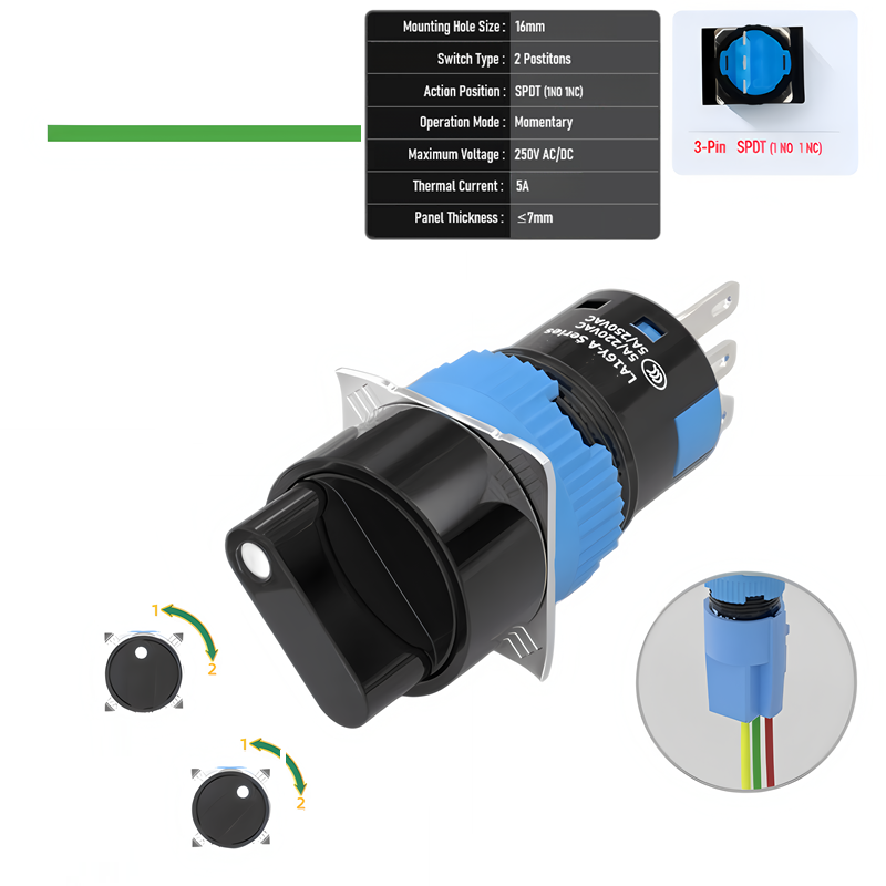 16mm Round Maintained Rotary Switch 2/3 Position NO NC Panel Mount