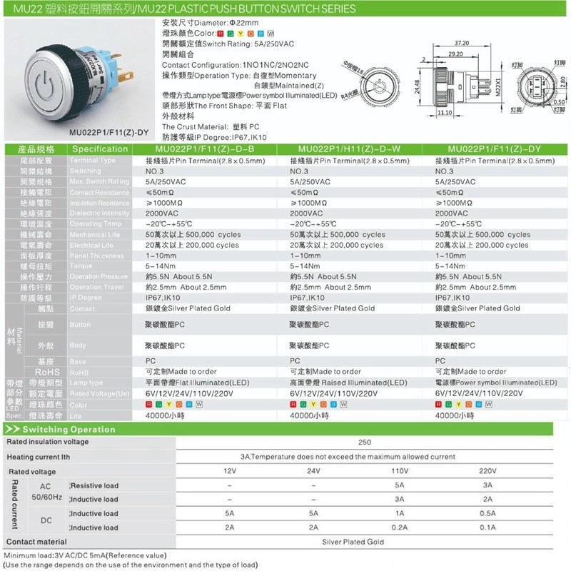 | Mechanical Life: | Maintained:100,0000 Momentary:100,0000 Selector/Keylock:250000 |